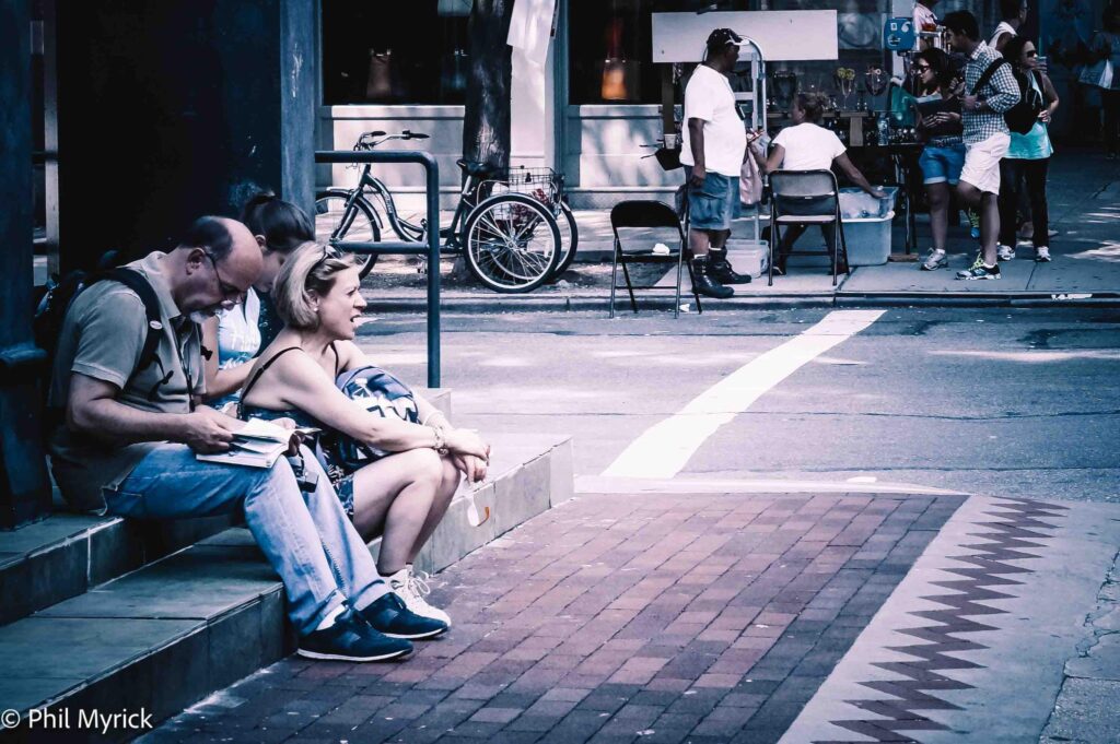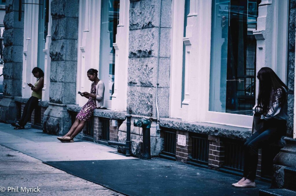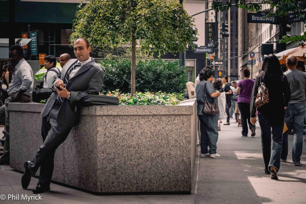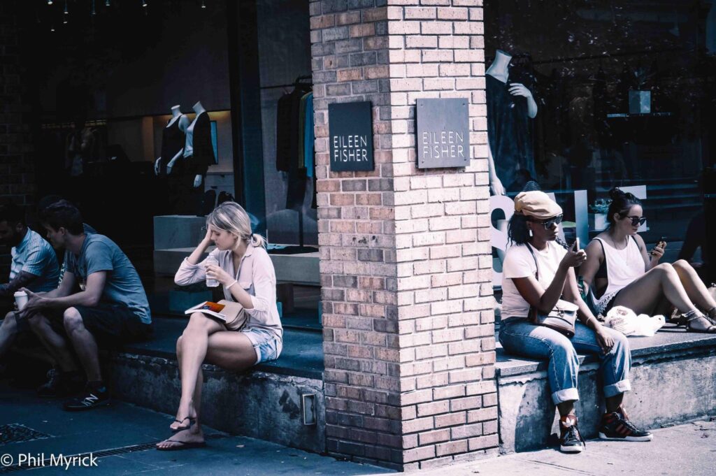Then a couple parked on a curb, the whole city scene receding behind them. Then a suited man pressing his back against a granite planter, the sidewalk streaming past. People occupying a brick storefront ledge — sitting, waiting, observing — using an edge the city accidentally provided. Three people against a stone facade, each absorbed in a phone, spaced apart at careful intervals, all of them using the wall the same way: as a place to be in public without being fully in it.