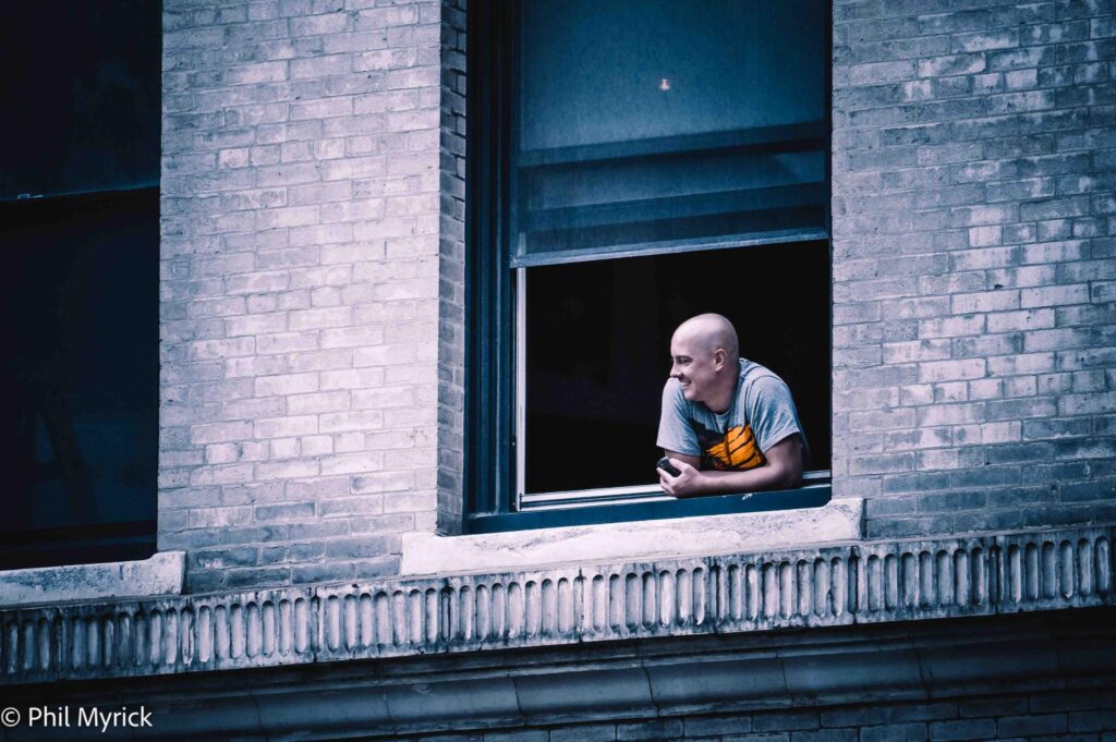Another image: a man leaning out of an upper-story window, smiling at the street. Not on the street. Watching it. Taking obvious pleasure in the watching itself, before any question of joining arose.
